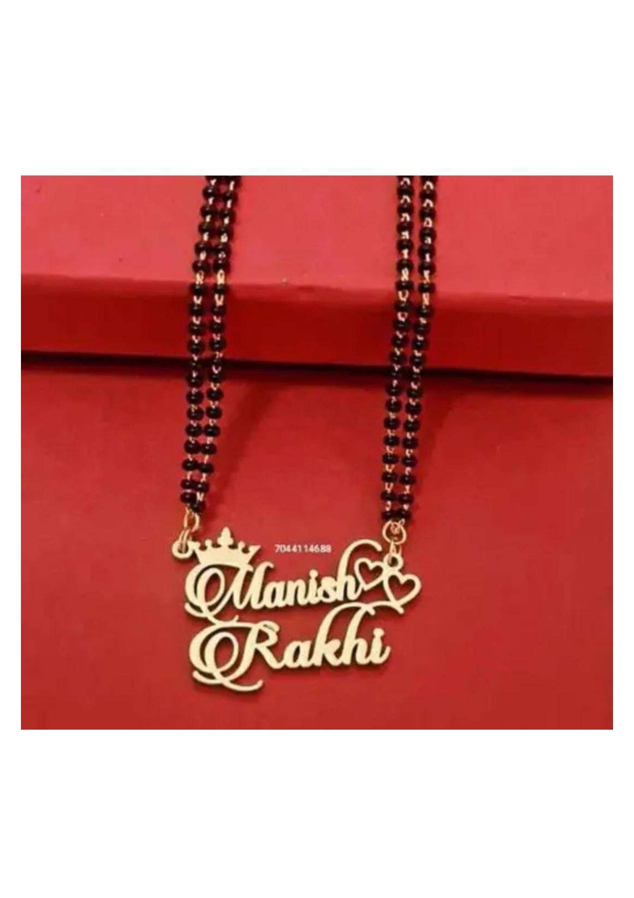 Express your love with this Personalized Couple Name Pendant Necklace engraved with the names “Manish & Rakhi.” The design includes elegant crowns and two intertwined hearts, symbolizing a royal and everlasting bond. Crafted with a lustrous gold-plated finish, it comes with a traditional black-beaded chain for a classic look.